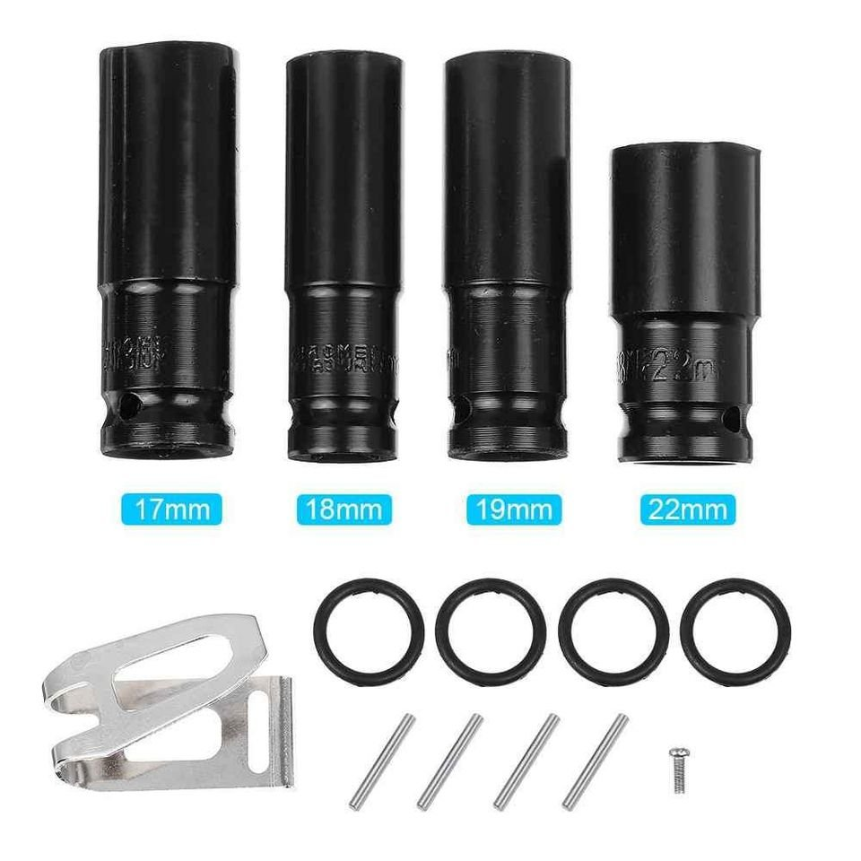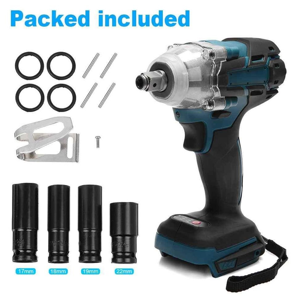 Fit For 18V Makita battery Color: black + blue Rated input power: 1280 (w) Type: Impact wrench Screw diameter: 22 Power Type: Rechargeable - Lithium Technology Power supply voltage: 220V Number of revolutions: 3000 (rpm) Handle type: Hand-held Maximum size of mounting screws 0-28(mm) Square head nominal size: 12.7 (mm) Impact number: 0-3300 (ipm) drive shaft / chuck drive Tightening capacity _ standard bolt: 0-28 Tightening ability _ high strength bolt: 10-16 Package Included Impact Wrench+ 4PC Socket: 1 x Electric Wrench 4X Socket set size:17mm 18mm 19mm 22mm 1X Hook and screw 2X Steel bolt