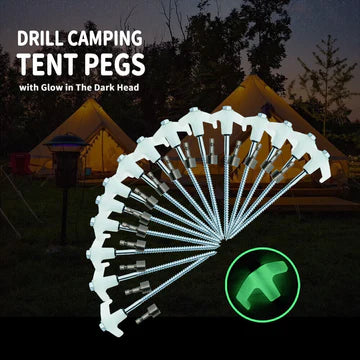15X HEAVY DUTY STEEL SCREW / DRILL CAMPING TENT PEGS WITH GLOW IN THE DARK HEAD