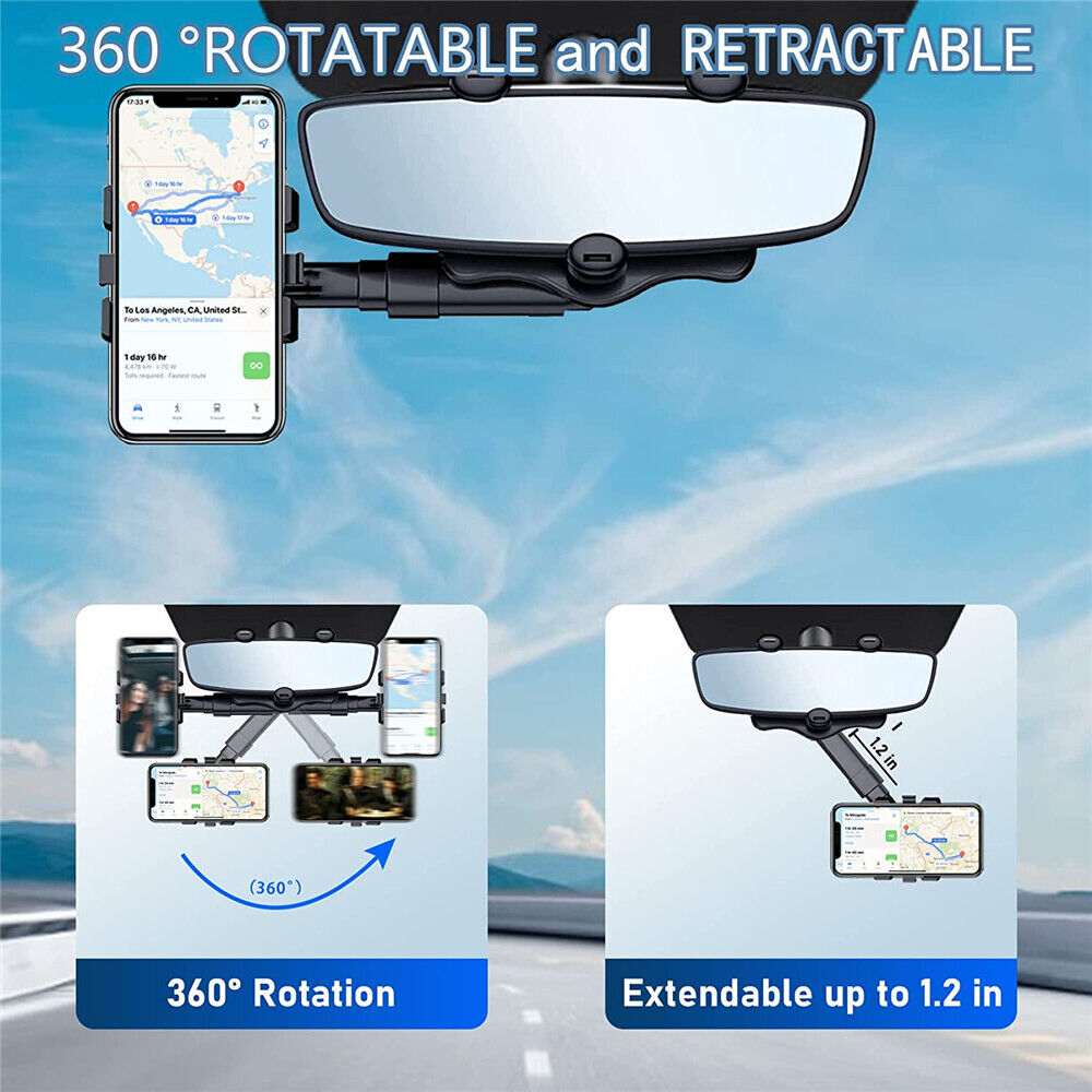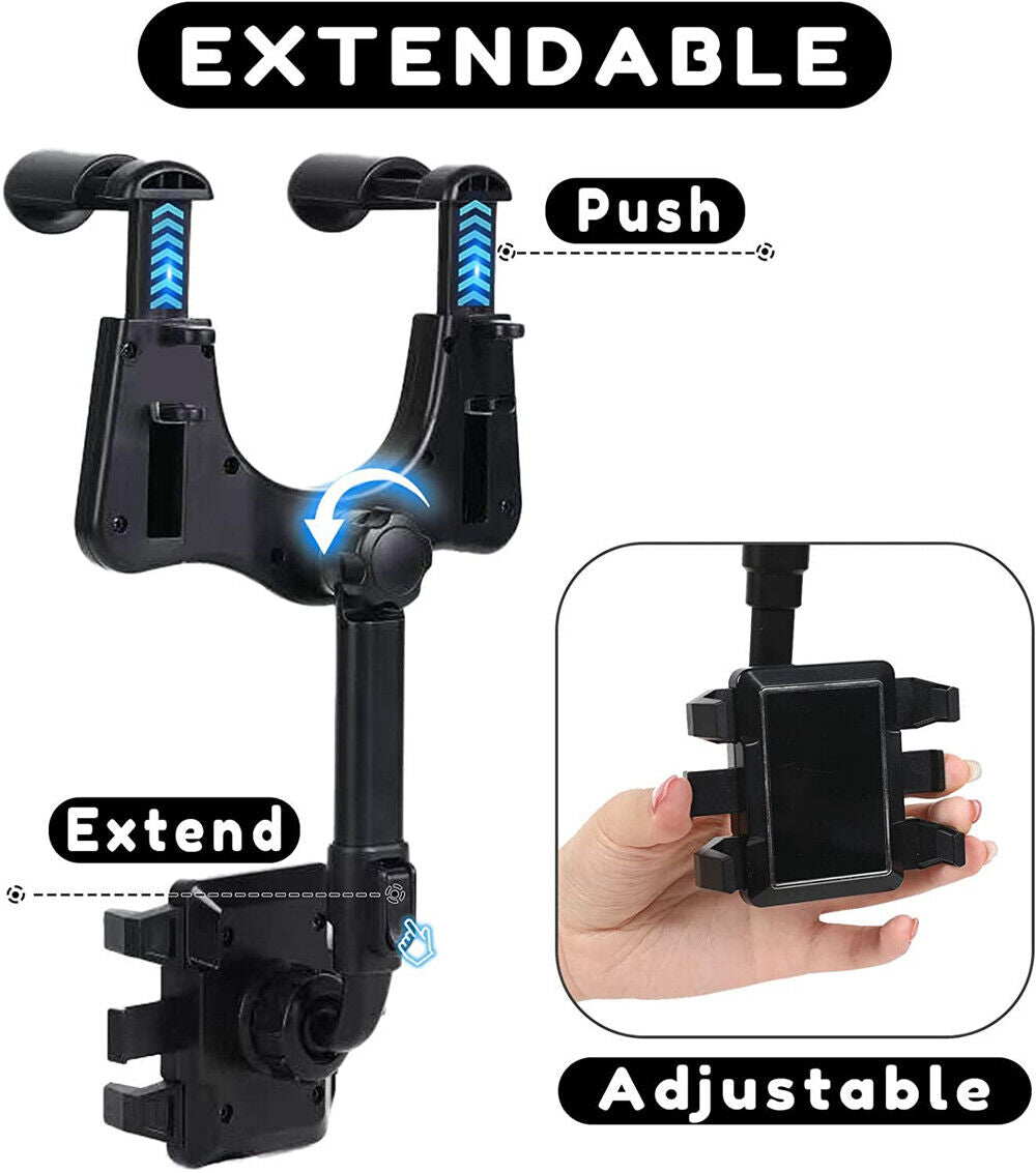 - 360¡ãRotatable & Retractable Car Holder¡¿New version multifunctional rearview mirror phone holder adopts a 360¡ãrotating structure, Switch between horizontal and vertical screens at will. The arm length can be retractable by 0~2inch, super flexible design provide you with the best viewing angle.
