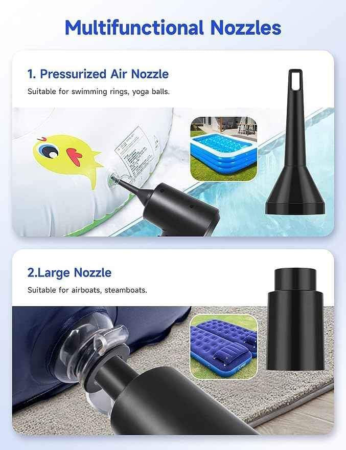 [Multiple Uses]: Compressed air comes with 5 sets of nozzles, meet different needs.Suitable for dust removal of computer cases, keyboards, cars, fans, lily windows, etc.The multifunctional nozzle is used to inflate swimming rings, yoga balls, steamboats, air mattresses, inflatable toys, etc.
