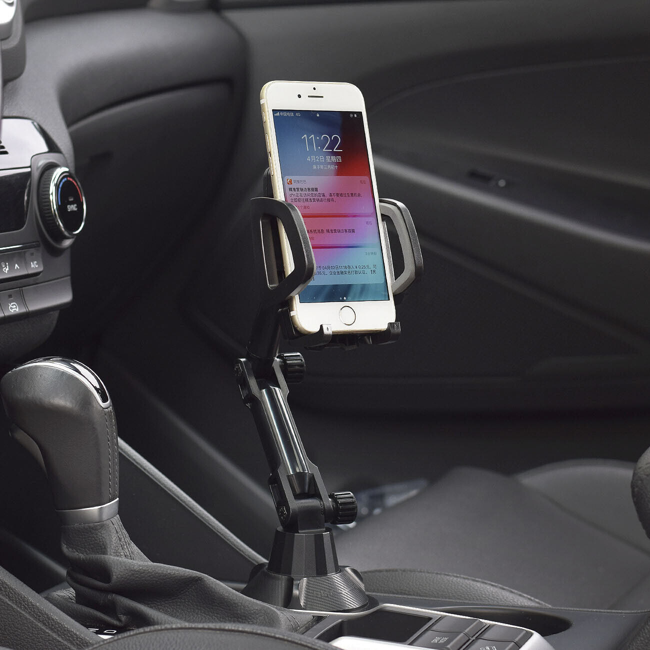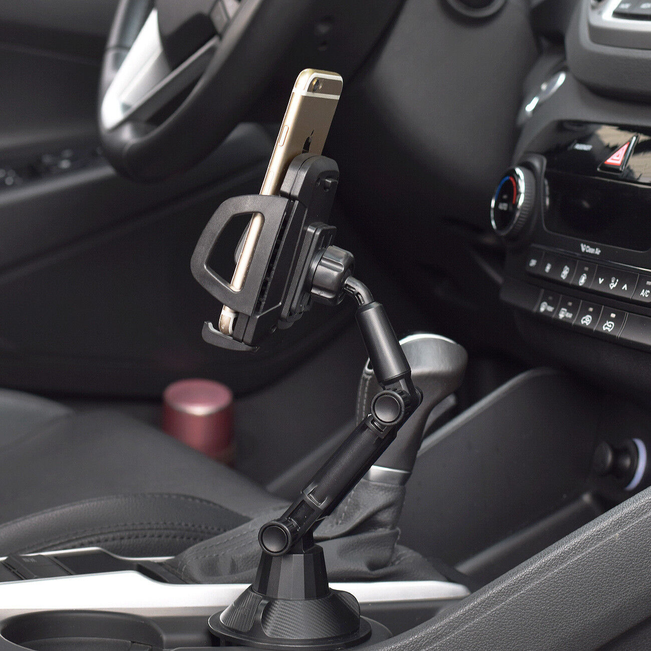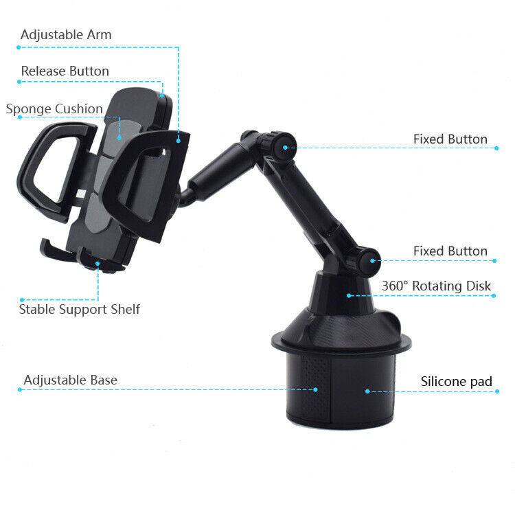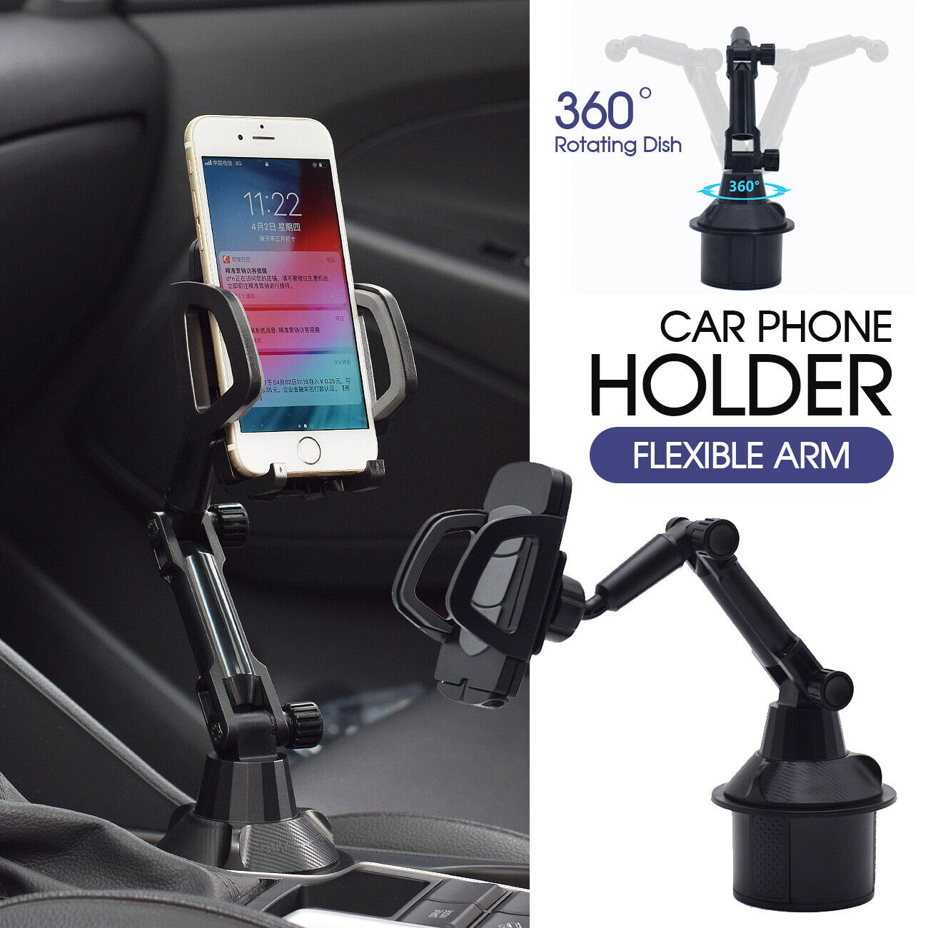 - Universal Cup Holder Car Mount With Long Adjustable Arm And Rotatable Cradle With Quick Release Button