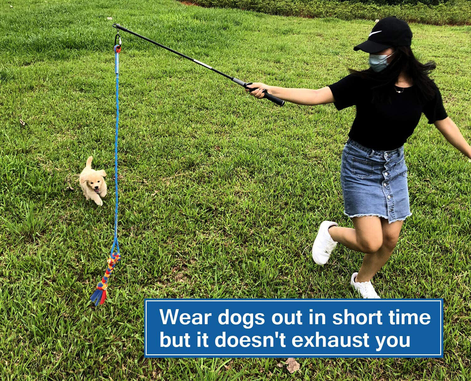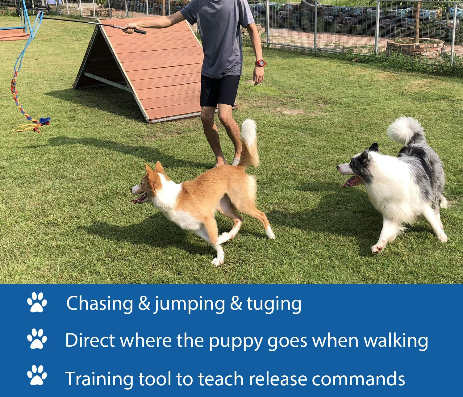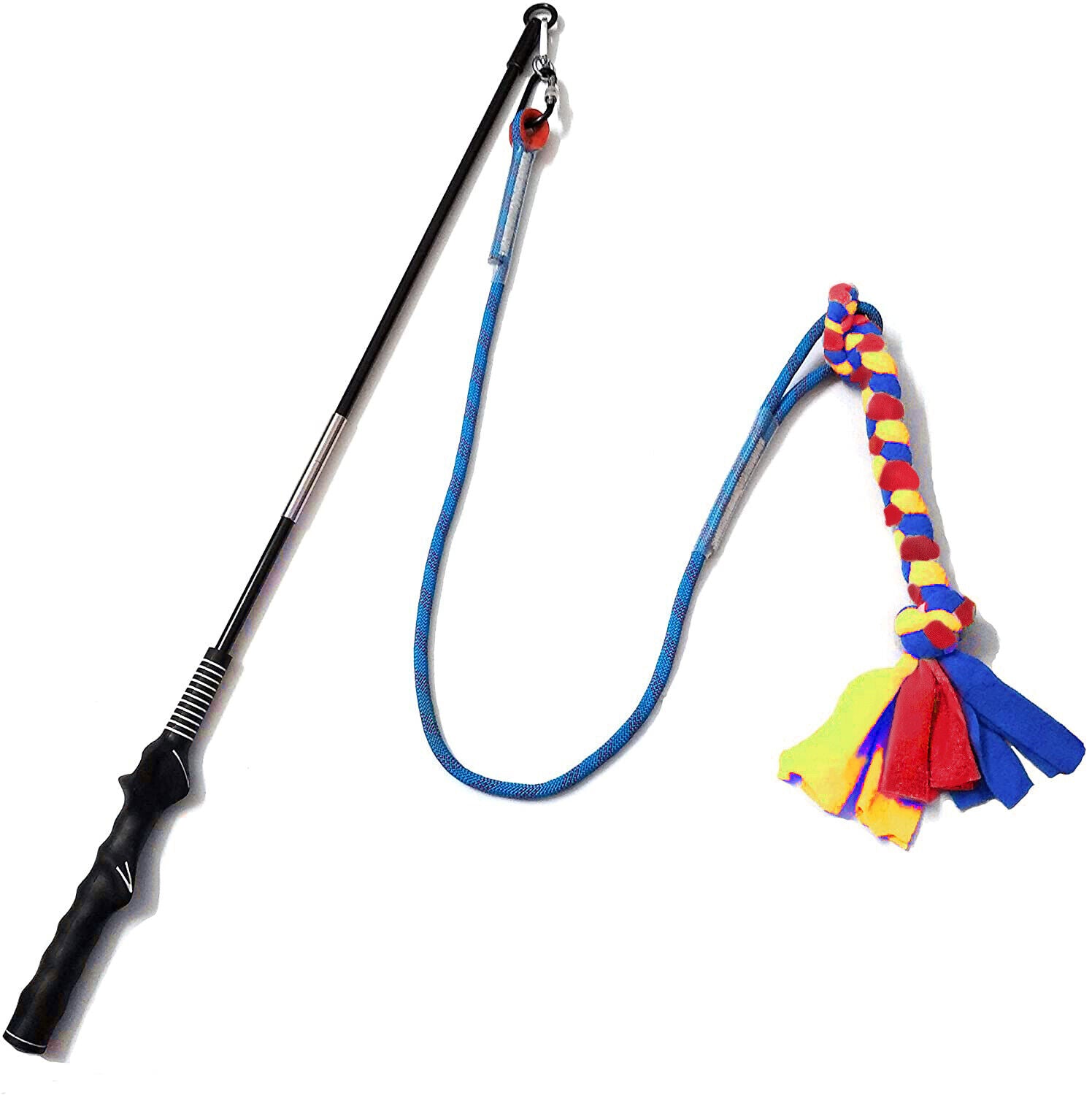 - Color: Blue.- Material: Aluminium alloy, nylon and cotton.- Size L: 90cm (Extended Length); 26cm (Constricted Length); 100cm (Rope Length);- Keep you dog happy and healthy.- Extendable collapsible pole, easy to carry and storage.- Works great as a training tool and provides the mental exercise dogs need.- The length of the dangler keeps little fingers far away from claws, preventing accidental scratching wherever possible.