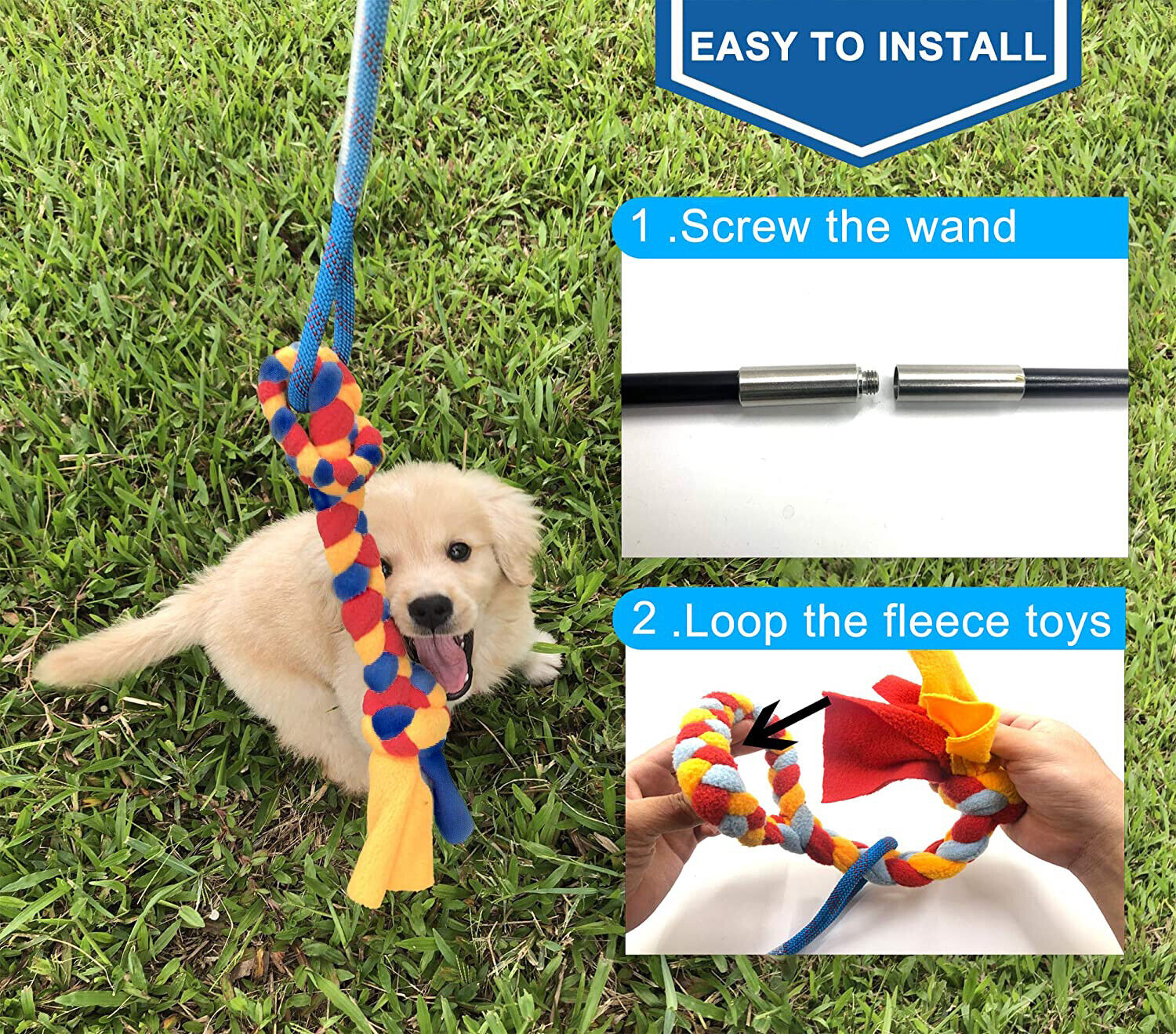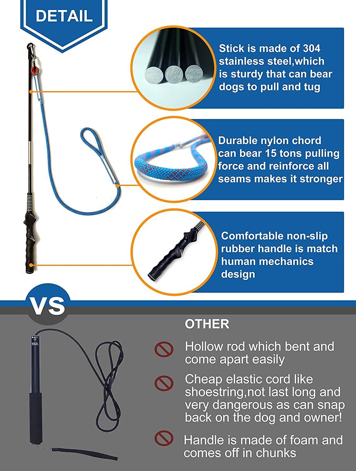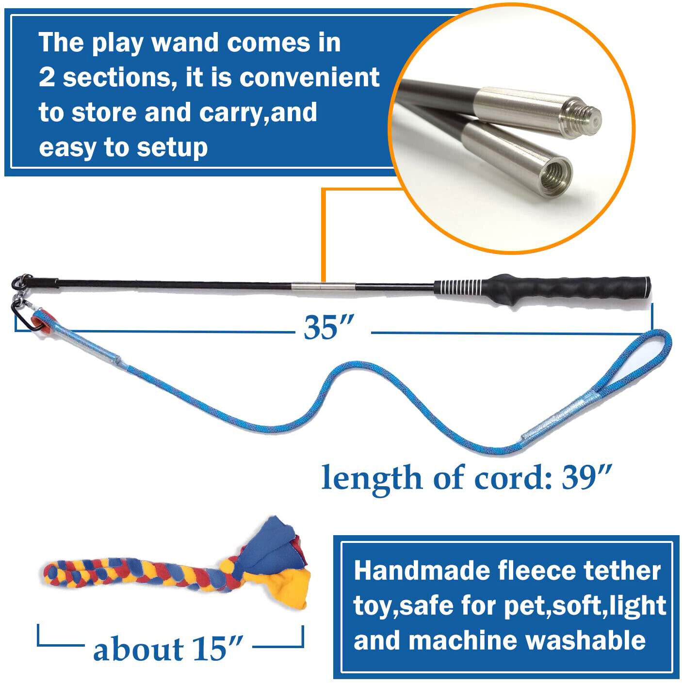 - Color: Blue.- Material: Aluminium alloy, nylon and cotton.- Size L: 90cm (Extended Length); 26cm (Constricted Length); 100cm (Rope Length);- Keep you dog happy and healthy.- Extendable collapsible pole, easy to carry and storage.- Works great as a training tool and provides the mental exercise dogs need.- The length of the dangler keeps little fingers far away from claws, preventing accidental scratching wherever possible.