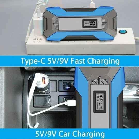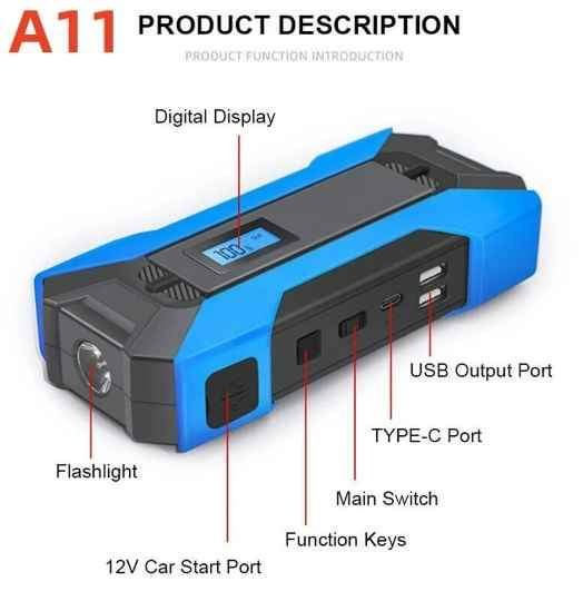 Product Name: Car Jump Starter Model: A11/A12 Size: 175x82x42mm / 6.88''x3.22''x1.65'' Color: Blue, Black Material: ABS(Acrylonitrile Butadiene Styrene) Applicable Models: 12V Starting Current: 400A Peak Current: 800A Input: 5V-2A, 9V-2A USB Port: 5V-2A, 9V-2A Capacity: 25000mAh Charging Time: 5-8 Hours Feature: -Large capacity, small size, delicate appearance. -Start 12V car in emergency. -Charge most of electronic equipment in emergency. -High brightness, multi-mode LED flashlight.99900mAh