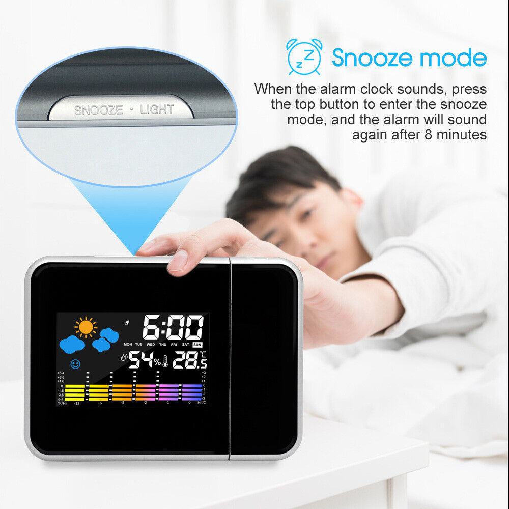 - Projection Alarm Clock, Digital Clock Projector on Ceiling with Indoor/Outdoor Temperature and thermometer Display, Alarms, Snooze, Colored Backlight, - Weather Forecast, and Battery Backup for Bedroom